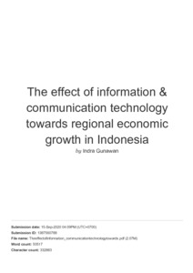Nowadays, information and communication technology is becoming important part within the economic development. The rapid development of information and communication technology has changed the lifestyle of Indonesian society, either in rural or urban area. This occurred since the presence of the variety of social media applications spread rapidly. Furthermore, this development was automatically affected the growth of regional economy. This study observed the influence of information and communication technology towards regional economic growth in Indonesia that was represented by value of Gross Regional Domestic Product in 33 provinces in Indonesia in 2014 and 2015. The variable of information and communication technology was obtained by purposive sampling. The sample were cellular phone users, household with internet access, household that use internet access which represented by the household that accessed internet in last three months, household that had and could operated computer, and household that had wired telephone. This study examined each sample category and compared them to identify the effect toward Gross Regional Domestic Product. The data were processed using SmartPLS software version 3.2.7. The results showed that sample category that significantly affected Gross Regional Domestic Product was the household that used internet, while the other categories did not have significant influence. For every 1% enhancement of household growth that used internet would encourage 0.66% of Gross Regional Domestic Product. Even though, many household used internet access, it did not have positive impact on economic development if the internet was rarely used. Therefore, if a region wanted to improve its regional economic growth, it can be done by increasing the use of internet household. Keyword: gross domestic product, regional product, information technology, communication technology, economic growth, internet access.