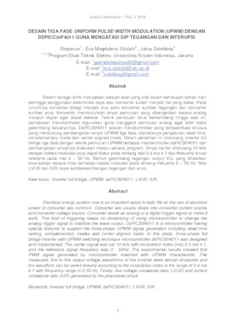 Stepanus, Stepanus and Silalahi, Eva Magdalena and Salebbay, Jalius (2018) Desain Tiga Fase Uniform Pulse-Width Modulation (UPWM) Dengan Dspicc30f4011 Guna Mengatasi Dip Tegangan Dan Interupsi. Jurnal Lektrokom, 1 (1). pp. 1-10.