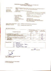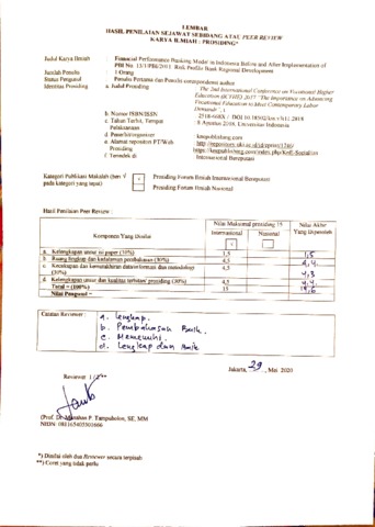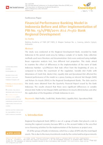 Sintha, Lis (2018) Financial Performance Banking Model in Indonesia Before and After Implementation of PBI No. 13/1/PBI/2011: Risk Profile Bank Regional Development. In: The 2nd International Conference on Vocational Higher Education (ICVHE) 2017. KnE Publishing, UAE, pp. 937-951.