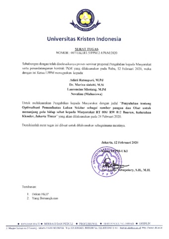 Silalahi, Marina (2020) PKM Penyuluhan Tentang Optimalisasi Pemanfaatan Lahan Sekitar Sebagai Sumber Pangan Dan Obat. UKI, Jakarta. (Unpublished)