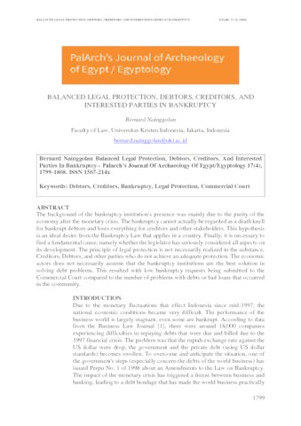 Nainggolan, Bernard (2020) BALANCED LEGAL PROTECTION, DEBTORS, CREDITORS, AND INTERESTED PARTIES IN BANKRUPTCY. PalArch’s Journal of Archaeology of Egypt / Egyptology, 17 (4). pp. 1799-1808.