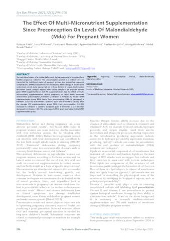 Yekti, Rahayu and Widasari, Lucy and Monoarfa, Yustiyanty and Bukhari, Agussalim and Jafar, Nurhaedar and Ottoluwa, Anang and Thaha, Abdul Razak (2021) The Effect Of Multi-Micronutrient Supplementation Since Preconception On Levels Of Malondialdehyde (Mda) For Pregnant Women. Systematic Reviews in Pharmacy, 12 (3). pp. 296-300. ISSN 0976 2779