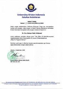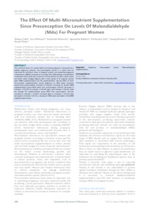 The nutritional status of a mother before and during pregnancy is important for a healthy pregnancy outcome. The preconception period is a critical time for improving the nutritional status of pregnant women and preventing pregnancy complications. (MMN) compared to iron folate (IFA). Methodology: A double-blind randomized cohort study was carried out in three districts of Luwuk, South Luwuk, and North Luwuk, Banggai Regency with a total sample of 19 pregnant women given MMN supplementation and IFA supplementation. See the effect of multimicronutrient supplementation during pregnancy on MDA levels measured several times (preconception, trimester 1, trimester 2, trimester 3). Results: MMN supplementation group MDA levels from preconception (144.43) decreased in trimester 1 (127.60) to trimester 2 (130.94) again until trimester 3 (96.03), while the average IFA supplementation group MDA from preconception (110.54), increased in trimester 1 (153.87) increased again in trimester 2 (172.50) then decreased in trimester 3 (81.75), a decrease in MDA levels was better in the MMN supplementation group.