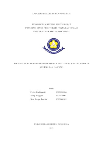 Budhyanti, Weeke and Anggiat, Lucky and Juwita, Citra Puspa (2021) EDUKASI PENANGANAN HIPERTENSI DAN PENGAPURAN BAGI LANSIA DI KELURAHAN CAWANG. Project Report. Prodi Fisioterapi Universitas Kristen Indonesia, Jakarta. (Unpublished)