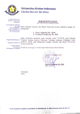 Anggraini, Nenny and Regina, Desideria and Sembiring, Carolina F (2020) Analisis Kinerja Kualitas Pelayanan Terhadap Kepuasan Pelanggan Kartu Simpati (Studi Pada Mahasiswa Fakultas Ekonomi dan Bisnis Universitas Kristen Indonesia). UKI, Jakarta. (Unpublished)