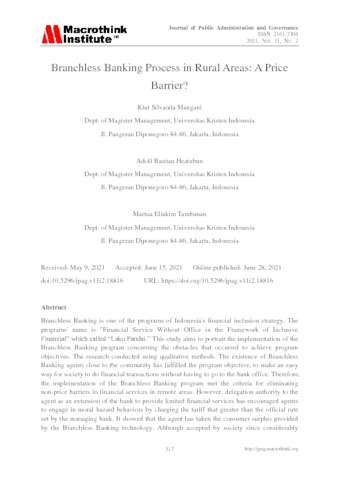 Branchless Banking is one of the programs of Indonesia's financial inclusion strategy. The programs' name is "Financial Service Without Office in the Framework of Inclusive Financial" which called “Laku Pandai.” This study aims to portrait the implementation of the Branchless Banking program concerning the obstacles that occurred to achieve program objectives. The research conducted using qualitative methods. The existence of Branchless Banking agents close to the community has fulfilled the program objective, to make an easy way for society to do financial transactions without having to go to the bank office. Therefore, the implementation of the Branchless Banking program met the criteria for eliminating non-price barriers in financial services in remote areas. However, delegation authority to the agent as an extension of the bank to provide limited financial services has encouraged agents to engage in moral hazard behaviors by charging the tariff that greater than the official rate set by the managing bank. It showed that the agent has taken the consumer surplus provided by the Branchless Banking technology. Although accepted by society since considerably cheaper than the fee to go to the nearest bank office, that condition becomes a price barrier for the future development of Branchless Banking.