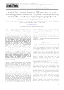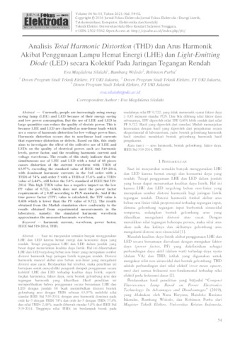 Silalahi, Eva Magdalena and Widodo, Bambang and Purba, Robinson (2021) Analisis Total Harmonic Distortion (THD) dan Arus Harmonik Akibat Penggunaan Lampu Hemat Energi (LHE) dan Light-Emitting Diode (LED) secara Kolektif Pada Jaringan Tegangan Rendah. Jurnal Fokus Elektroda : Energi Listrik, Telekomunikasi, Komputer, Elektronika dan Kendali), 6 (1). pp. 54-62. ISSN 2502 5562