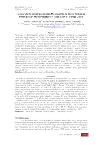 Saludung, Samuel and Sihotang, Hotmaulina and Limbong, Mesta (2021) Pengaruh Kepemimpinan dan Motivasi Kerja Guru Terhadap Peningkatan Mutu Pendidikan Pada SMK di Toraja Utara. Jurnal Pendidikan Tambusai, 5 (1). pp. 449-459. ISSN 2614 6754