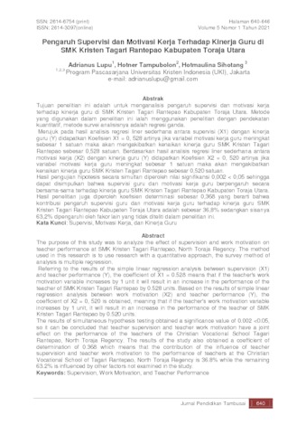 Lupu, Adrianus and Tampubolon, Hotner and Sihotang, Hotmaulina (2021) Pengaruh Supervisi dan Motivasi Kerja Terhadap Kinerja Guru di SMK Kristen Tagari Rantepao Kabupaten Toraja Utara. Jurnal Pendidikan Tambusai, 5 (1). pp. 640-646. ISSN 2614 6754