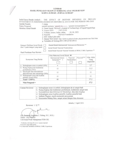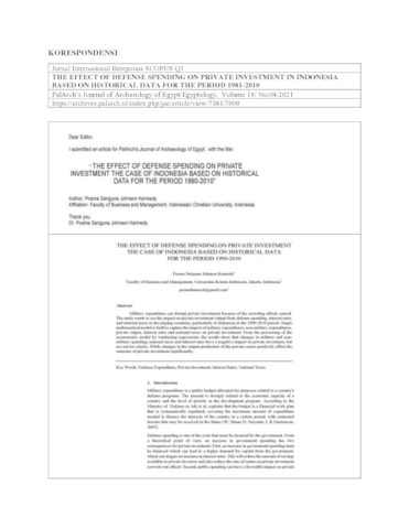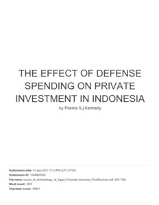 Kennedy, Posma Sariguna Johnson (2021) THE EFFECT OF DEFENSE SPENDING ON PRIVATE INVESTMENT IN INDONESIA BASED ON HISTORICAL DATA FOR THE PERIOD 1981-2010. PALARCH’S JOURNAL OF ARCHAEOLOGY OF EGYPT/EGYPTOLOGY, 18 (4). pp. 7094-7102.
