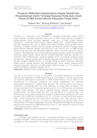 Tiku, Ardiana and Simbolon, Bintang R. and Kailola, Lisa Gracia (2021) Pengaruh Efektivitas Kepemimpinan Kepala Sekolah Dan Pengembangan Karier Terhadap Kepuasan Kerja Guru (Studi Kasus Di SMA Kristen Barana Kabupaten Toraja Utara). Jurnal Pendidikan Tambusai, 5 (1). pp. 465-474. ISSN 2614 3097