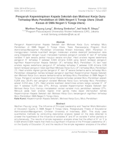 Pengaruh Kepemimpinan Kepala Sekolah dan Motivasi Kerja Guru terhadap Mutu Pendidikan di SMA Negeri 5 Toraja Utara. Tesis Pascasarjana Program Studi Administrasi/Manajemen Pendidikan Universitas Kristen Indonesia, 2021. Penelitian ini menggunakan metode kuantitatif dengan melakukan analisis deskriptif berdasarkan data yang didapatkan dengan tujuan menjawab hipotesis pengaruh variabel X1 dan X2 terhadap variabel Y baik secara parsial maupun secara simultan. Hasil analisis regresi sederhana pengaruh X1 terhadap Y sebesar 0,024 dimana 0,024 yang berarti terdapat pengaruh signifikan Kepemimpinan Kepala Sekolah (X1) terhadap Mutu Pendidikan (Y) dan hasil analisis regresi sederhana pengaruh X2 terhadap terhadap Y sebesar 0,06 dimana 0,06 berarti terdapat pengaruh tidak signifikan Motivasi Kerja Guru (X2) terhadap Mutu Pendidikan . Hasil analisis regresi ganda pengaruh X1 dan X2 secara bersama sama terhadap Mutu (Y)Pendidikan didapatkan bahwa terdapat pengaruh signifikan Kepemimpinan Kepala Sekolah dan Motivasi Kerja Guru secara bersama-sama terhadap Mutu Pendidikan di SMA Negeri 5 Toraja. Pengaruh variabel Kepemimpinan Kepala terhadap variabel Mutu Pendidikan adalah 0,204 atau 20,4% dan pengaruh variabel Motivasi Kerja Guru terhadap Mutu Pendidikan adalah 0,012 atau 1,2%. Hasil analisis koefisien determinasi antara ketiga variabel X1, X2 dan Y sebesar 0,270 atau 27%. Artinya, variabel Kepemimpinan Kepala Sekolah dan Motivasi Kerja Guru mampu menjelaskan variasi variabel mutu pendidikan sebesar 27%. Merujuk pada hasil analisis regresi linier ganda maka dapat disimpulkan bahwa Kepemimpinan Kepala Sekolah dan Motivasi Kerja Guru berpengaruh signifikan terhadap Mutu Pendidikan SMA Negeri 5 Toraja Utara.