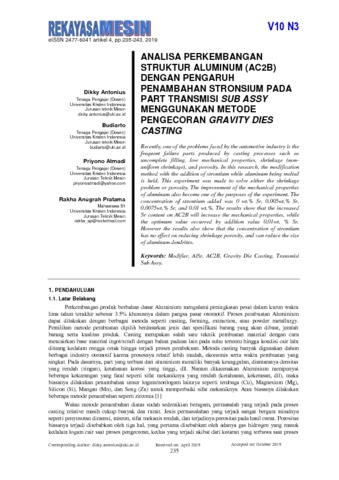 Hutauruk, Dikky Antonius and Budiarto, Budiarto and Atmadi, Priyono and Pratama, Rakha Anugrah (2019) ANALISA PERKEMBANGAN STRUKTUR ALUMINUM (AC2B) DENGAN PENGARUH PENAMBAHAN STRONSIUM PADA PART TRANSMISI SUB ASSY MENGGUNAKAN METODE PENGECORAN GRAVITY DIES CASTING. Rekayasa Mesin, 10 (3). pp. 235-243. ISSN 2477 6041