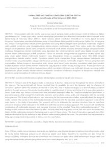 Tempo adalah salah satu media yang punya sejarah panjang dalam perkembangan media di Indonesia. Dalam perjalanannya itu, Tempo juga cukup cekatan menangkap perubahan pola konsumsi masyarakat ketika Internet mulai berkembang di Indonesia tahun 1990-an. Salah satunya adalah melakukan diversifikasi ke media digital bernama tempo.co. Kemampuan membaca kebutuhan pasar ini juga dibawa dalam praktik jurnalismenya. Sekitar tiga tahun yang lalu, tempo.co mengeluarkan sebuah praktik jurnalisme baru yang dikenal dengan istilah jurnalisme multimedia longform yakni praktik jurnalisme yang menggabungkan elemen-elemen multimedia seperti foto, video, audio dan infografik dengan teknik penulisan naratif. Jenis jurnalisme ini menarik untuk diteliti terutama berkaitan dengan penyajian konten medianya. Beragamnya elemen multimedia yang digunakan dan teknik jurnalisme naratif yang dipakai menarik untuk diamati dalam perkembangan praktik jurnalisme. Tulisan ini mencoba menggambarkan bagaimana struktur narasi teks pada enam paket tulisan multimedia longform yang ditayangkan tempo.co sepanjang tahun 2014-2016 dengan menggunakan metode analisis naratif. Tujuannya adalah untuk mengetahui fungsi elemen-elemen multimedia dan struktur narasi yang ditampilkan sebagai satu kesatuan produk jurnalisme multimedia longfom. Temuan yang diperoleh menunjukkan bahwa tempo.co menawarkan jenis tulisan yang bukan hanya panjang, mendalam tetapi juga semakin mudah dipahami berkat elemen-elemen multimedia yang digunakan dalam masing-masing tulisan. Praktik jurnalisme ini juga menawarkan alternatif medium bagi pembaca untuk memahami informasi yang melimpah dengan cara yang mudah dipahami dan efisien melalui elemen-elemen multimedia. Jurnalisme multimedia longform ini berpotensi menjadi tren jurnalisme yang menjanjikan di Indonesia di masa depan. KATA KUNCI: Jurnalisme Multimedia Longform, Media Digital, Jurnalisme Naratif, dan tempo.co/Tempo is one of the biggest media in Indonesia. It also has a long journey throughout the history of media in this country. The successful path of Tempo resulted from its capability to catch the dynamics and the changing of consumer’s pattern within the initiation of Internet in early ‘90s. One of its best strategies is to diversify their journalism platform through tempo.co. Tempo also has the ability to read the needs of market and brings it to its journalism practice. About three years ago, tempo.co issued their new journalism approach called the “longform multimedia journalism” a journalism practice that merged the multimedia elements such as photo, video, audio, and infographic with the narrative writing technic. This branch of journalism is very interesting for the communication studies, especially about the design of media content. The variety in the multimedia elements combined with the narrative journalism approach is one of the main topics in the study of journalism. This research will try to elaborate the narrative structure from six long-form articles in tempo.co which released in the 2014-2016 with the narrative-analysis approach. This research will identify the combination of multimedia elements and narrative structure in the so-called “long-form multimedia journalism”. The findings in this research show that tempo.co offers not only deep and long-wrote article, but also easier to understand, thanks to the multimedia elements that being used in each of these articles. This kind of journalism approach also offers medium alternative for the audience to have a better understanding about the issues. This journalism has the potential to bring a promising trend of journalism in Indonesia in the near future. KEYWORDS: Longform Multimedia Journalism, Digital Media, Narrative Journalism, and tempo.co