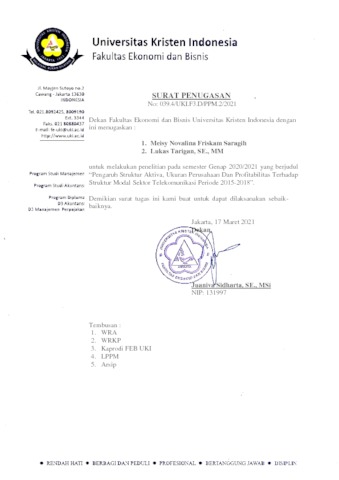 Saragih, Meisy Novalina Friskam and Tarigan, Lucas (2021) PENGARUH STRUKTUR AKTIVA, UKURAN PERUSAHAAN DAN PROFITABILITAS TERHADAP STRUKTUR MODAL SEKTOR TELEKOMUNIKASI PERIODE 2015-2018 = THE INFLUENCE OF ASSET STRUCTURE, COMPANY SIZE AND PROFITABILITY ON TELECOMMUNICATION SECTOR CAPITAL STRUCTURE LISTED IN INDONESIA STOCK EXCHANGE 2015-2018. (Unpublished)