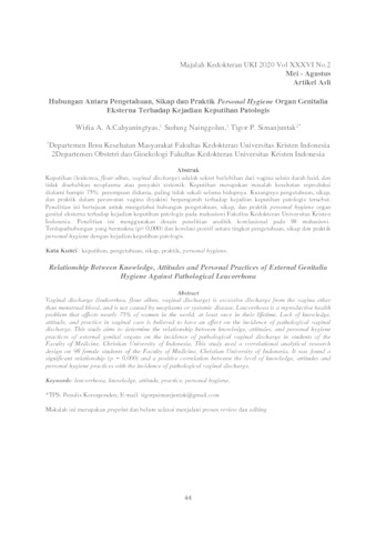 Cahyaningtyas, Widia A. A. and Nainggolan, Sudung and Simanjuntak, Tigor Peniel (2020) Hubungan Antara Pengetahuan, Sikap dan Praktik Personal Hygiene Organ Genitalia Eksterna Terhadap Kejadian Keputihan Patologis. Majalah Kedokteran UKI, 36 (2). pp. 44-48. ISSN 0216 4752