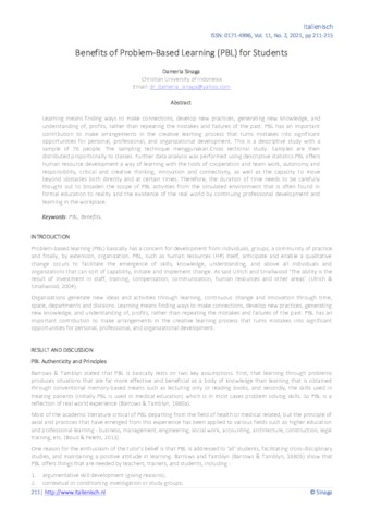 Sinaga, Dameria (2021) Benefits of Problem-Based Learning (PBL) for Students. Italienisch, 11 (2). pp. 211-215. ISSN 0171 4996