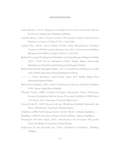 Sistem desentralisasi pendidikan telah mewajibkan partisipasi masyarakat guna meningkatkan mutu pendidikan. Karena itu, sangat dibutuhkan kerjasama antara pihak sekolah, masyarakat melalui komite sekolah dan orangtua siswa. Jika kerjasama ketiga pihak tersebut terjalin dengan baik, maka akan tercipta rasa memiliki serta turut bertanggungjawab masyarakat dan orangtua dalam upaya meningkatkan mutu pendidikan di sekolah. Dengan demikian, partisipasi komite sekolah dan orangtua dalam meningkatan mutu pendidikan di sekolah serta usaha kepala sekolah dalam memberikan kesempatan atau peluang kepada komite sekolah dan orangtua siswa untuk partisipasi sangat diperlukan. Tesis ini bertujuan mendeskripsikan partisipasi komite sekolah dan orangtua dalam meningkatan mutu pendidikan di sekolah serta usaha kepala sekolah dalam memberikan kesempatan atau peluang kepada komite sekolah dan orangtua siswa untuk partisipasi meningkatkan mutu pendidikan di SD YPK Fakfak. Metode penelitian yang digunakan adalah metode deskriptif kualitatif dengan jenis penelitian fenomenologi. Dari hasil penelitian, disimpulkan bahwa: (1) Partisipasi komite sekolah terealisasi dalam bentuk memberikan pertimbangan terhadap penentuan dan pelaksanaan kebijakan pendidikan, menggalang dana dan sumber daya pendidikan lainnya, mengawasi pelayanan pendidikan terutama sarana prasarana dan ketenagaan, serta menindaklanjuti aspirasi masyarakat terutama orangtua siswa. (2) Partisipasi orangtua siswa terwujud dalam aspek perencanaan, pelaksanaan dan evaluasi program sekolah. (3) Usaha kepala sekolah dalam memberikan kesempatan atau peluang kepada komite sekolah dan orangtua siswa untuk partisipasi diwujudkan dengan cara melibatkan komite sekolah dan orantua dalam perencanaan, pelaksanaan dan evaluasi program sekolah, melibatkan ketua komite sekolah dalam pengesahan RKAS, membangun komunikasi yang harmonis antara sekolah dengan komite sekolah dan orangtua, serta menerapkan transparansi keuangan sekolah. Kata Kunci: Partisipasi masyarakat, komite sekolah, orangtua siswa, dan kepala sekolah./ The decentralization system of education has obliged the participation of the community to improve the quality of education, because it is much needed cooperation beetwen the school, community through the school committee and parents of students. If the cooperation of the three parties is well established then it will create a sense of belonging and also responsibilities of community and parents of students in an effort to improve the quality of education in schools. Threfore, the participation of school committees and parents of students in improving the quality of education in schools as well as the efforts of principals in providing opportunities to school committees and parents of students to participate is urgently needed. This thesis, aims to describe the participation of school committees and parents of student in improving the quality of education in school and principals efforts in providing opportunities to school committees and parents of students to participate in improving the quality of education at YPK Fakfak Primary School. Research method that is used is the descriptive qualitative method with the type of Phenomenological research. The result of study concluded that (1) The participation of school committees was realized in terms of giving consideration to the determination and implementation of education policy, raising funds and other education resources, overseeing educational services, especially pre-facilities and school administration personnel, and follow up the aspirations of the community, especially parents of students. (2) Parental participation is manifested in the planning, implementation, and evaluation aspects of school programs. (3) The principal’s efforts in providing opportunities to school committees and parents for participate are manifested by involving school committees and parents of students in the planning, implementation and evaluation of school programs, involving school committee leaders in RKAS endorsement, establishing communication harmonious between school with school committees and parents of student and implementing financial transparency of school. Keywords: Community participation, School committee, Parents of student, and Principal.