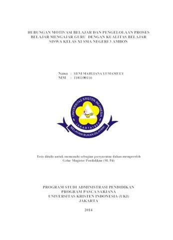 Lumamuly, Yeni Marliana (2014) Hubungan Motivasi Belajar Dan Pengelolaan Proses Belajar Mengajar Guru Dengan Kualitas Belajar Siswa Kelas XI Sma Negeri 3 Ambon. S2 thesis, Universitas Kristen Indonesia.
