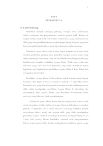 Pada saat ini belum ditemukan adanya data mengenai pola implementasi pendidikan Agama Hindu pada Tingkat SMA di Kota Bekasi termasuk faktor pendukung dan penghambatnya serta implementasi Peraturan Menteri Agama Nomor 16 Tahun 2010 tentang Pengelolaan Pendidikan Agama pada Sekolah. Maka peneliti melakukan penelitian mengenai bagaimana pola implementasi pendidikan Agama Hindu pada Tingkat SMA di Kota Bekasi dalam tahun pelajaran 2016/2017 dan apa saja faktor pendukung dan penghambatnya serta bagaimana implementasi Peraturan Menteri Agama Nomor 16 Tahun 2010 tentang Pengelolaan Pendidikan Agama pada Sekolah khususnya untuk pendidikan Agama Hindu. Dengan menggunakan metode pengumpulan data observasi, wawancara, dan dokumentasi serta melakukan analisis data dan uji validitas internal dan eksternal serta uji reliabilitas, peneliti menemukan pola dimana peserta didik yang beragama Hindu menerima pendidikan Agama Hindu dari lembaga keagamaan Hindu di luar dan pola sebagaimana ketentuan sistem pendidikan nasional yaitu peserta didik yang beragama Hindu mendapatkan pendidikan Agama Hindu dan diajarkan oleh guru yang beragama Hindu. Faktor pendukungnya adalah: pertama, kebijakan pemerintah; kedua, adanya pasraman; ketiga, fasilitas sarana dan prasarana. Faktor penghambatnya adalah pertama, lemahnya monitoring dan evaluasi; kedua, sulitnya mengimplementasi 2 (dua) kurikulum; ketiga, kurangnya kedisiplinan pendidik; keempat, kurangnya guru Agama Hindu dan kurangnya sarana prasarana; kelima, sedikitnya jumlah peserta didik beragama Hindu di satu sekolah; keenam, adanya perbedaan kurikulum yang membuat penilaian menjadi sulit untuk dilakukan. Peraturan Menteri Agama Nomor 16 tahun 2010 tentang Pengelolaan Pendidikan Agama pada Sekolah telah terimplementasi. Kata kunci : Pendidikan, Agama, Hindu / Currently, there is no data on the implementation pattern of Hindu religion education at SMA level in Bekasi City, including its supporting and inhibiting factors and the implementation of Regulation of the Minister of Religious Affairs No. 16/2010 concerning the Management of Religious Education at School. So researchers do research on how the pattern of implementation of Hindu religion education at high school level in the city of Bekasi in the academic year 2016/2017 and what are the supporting factors and obstacles and how the implementation of Regulation of the Minister of Religious Affairs No. 16 of 2010 on Management of Religious Education in schools, especially for religious education Hindu. By using data collection method of observation, interview, and documentation as well as performing data analysis and internal and external validity test and reliability test, the researcher find the pattern where Hindu learners receive Hindu religion education from Hindu religious institution outside and pattern as provision of education system National students who are Hindu students get Hindu religious education and are taught by Hindu teachers. The supporting factors are: first, government policy; Second, the pasraman; Third, facilities and infrastructure facilities. Inhibiting factors are first, weak monitoring and evaluation; Second, the difficulty of implementing 2 (two) curriculum; Third, the lack of discipline of educators; Fourth, the lack of teachers of Hinduism and lack of infrastructure; Fifth, the least number of Hindu students in one school; Sixth, the existence of different curriculum that makes the assessment becomes difficult to do. Regulation of the Minister of Religious Affairs No. 16 of 2010 on Management of Religious Education at School has been implemented. Keywords: Education, Religion, Hinduism