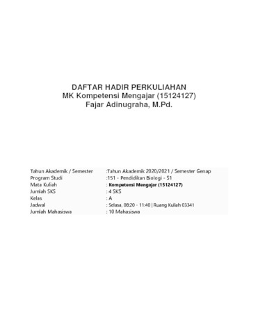 Adinugraha, Fajar (2021) Mata Kuliah : Kompetensi Mengajar. UKI. (Unpublished)