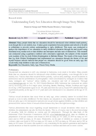Sinaga, Dameria and Simorangkir, Melda Rumia Rosmery (2021) Understanding Early Sex Education through Image Story Media. International Journal of Recent Innovations in Academic Research, 5 (8). pp. 103-108. ISSN 2635 3040