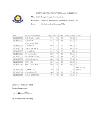 Sihotang, Hotmaulina (2021) Mata Kuliah: Pengembangan Pembelajaran. Program Pascasarjana Universitas Kristen Indonesia, Jakarta. (Unpublished)