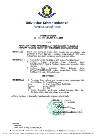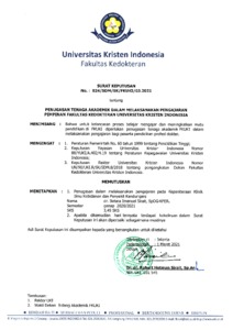 Sirait, Batara I. (2021) Surat Keputusan tentang Penugasan Tenaga Akademik dalam Melaksanakan Pengajaran Pimpinan Fakultas Kedokteran Universitas Kristen Indonesia. UKI. (Unpublished)