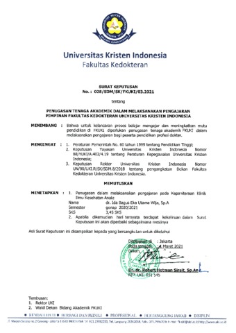 Wija, Ida Bagus Eka Utama (2021) Surat Keputusan tentang Penugasan Tenaga Akademik dalam Melaksanakan Pengajaran Pimpinan Fakultas Kedokteran Universitas Kristen Indonesia. UKI. (Unpublished)
