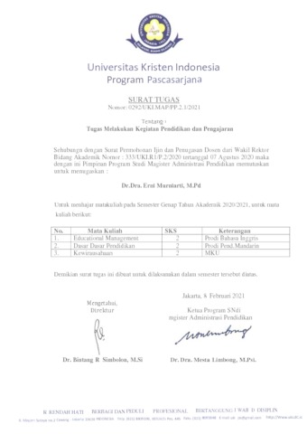 Murniarti, Erni (2021) Mata Kuliah : Dasar-dasar Manajemen Pendidikan. UKI. (Unpublished)