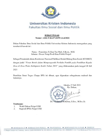 Mali, Fransiskus X. Gian Tue (2021) FENOMENA BOTOH DAN PERILAKU PEMILIH PADA PEMILIHAN KEPALA DESA DI DESA WATES KABUPATEN KEDIRI TAHUN 2019. In: Konferensi Nasional Publikasi Ilmiah Bidang Ilmu Sosial (ICOSSCI), 28 Juli 2021.