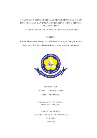 Manan, Abdul (2021) Analisis Yuridis Terhadap Penerapan Dakwaan dan Pemidanaan Dalam Perkara Tindak Pidana Pembunuhan (Studi Kasus Putusan Nomor: 51/PID.B/2015/PN.SBG.). S1 thesis, Universitas Kristen Indonesia.
