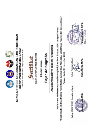 Adinugraha, Fajar and Ratnapuri, Adisti (2021) Students Perception Of Biodiversty Module With Local And Cultural Approach In Purworejo District = Persepsi Siswa Tentang Modul Keanekaragaman Hayati Dengan Pendekatan Kearifan Lokal dan Budaya di Kabupaten Purworejo. In: Prosiding Seminar Nasional Biologi Edukasi. Atlantis Press. ISBN 978 94 6239 394 3