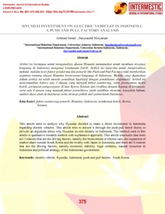 Artikel ini bertujuan untuk menganalisis alasan Hyundai memutuskan untuk membuat investasi langsung di Indonesia mengenai kendaraan listrik. Artikel ini mencoba untuk menjawabnya melalui melalui teori faktor pendorong dan penarik (the Push and Pull Factors) ntuk memberikan argumen tentang alasan Hyundai berinvestasi langsung di Indonesia. Metode yang digunakan dalam artikel ini ialah metode penelitian kualitatif dengan pendekatan eksplanatif. Artikel ini menyimpulkan bahwa ada 3 alasan yang menjadi faktor pendorong, yaitu fenenomena mobil listrik, perluasan pangsa pasar di luar Korea Selatan dan rivalitas dengan Jepang di Indonesia, serta ada 4 alasan yang menjadi faktor penariknya, ialah stabilitas ekonomi, kepastian hukum, sumber daya alam di Indonesia serta strategi politik dari pemerintah Indonesia. Kata Kunci: faktor pendorong-penarik, Hyundai, Indonesia, kendaraan listrik, Korea Selatan / This article aims to analyze why Hyundai decided to make a direct investment in Indonesia regarding electric vehicles. This article tries to answer it through the push-pull factor theory to provide an argument about why Hyundai invests directly in Indonesia. The method used in this article is qualitative research method with explanative approach. This article concludes that there are 3 reasons that are the driving factors, namely the fenenomena of electric cars, the expansion of market share outside South Korea and the rivalry with Japan in Indonesia, and there are 4 reasons that are the driving factors, namely economic stability, legal certainty, natural resources in Indonesia and political strategy of the Indonesian government. Keywords: electric vehicle, Hyundai, Indonesia, push and pull factors, South Korea
