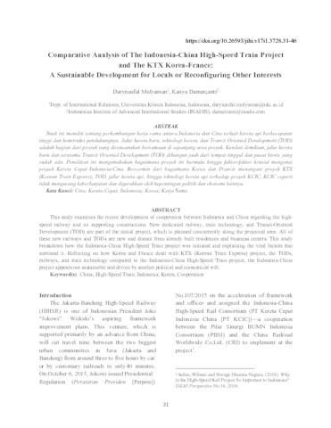 Studi ini meneliti tentang perkembangan kerja sama antara Indonesia dan Cina terkait kereta api berkecepatan tinggi dan konstruksi pendukungnya. Jalur kereta baru, teknologi kereta, dan Transit Oriented Development (TOD) adalah bagian dari proyek yang direncanakan bersamaan di sepanjang area proyek. Kendati demikian, jalur kereta baru dan terutama Transit Oriented Development (TOD) dibangun jauh dari tempat tinggal dan pusat bisnis yang sudah ada. Penelitian ini mengemukakan bagaimana proyek ini bermula hingga faktor-faktor krusial mengenai proyek Kereta Cepat Indonesia-Cina. Bercermin dari bagaimana Korea dan Prancis menangani proyek KTX (Korean Train Express), TOD, jalur kereta api, hingga teknologi kereta api terhadap proyek KCIC, KCIC seperti tidak mengusung keberlanjutan dan digerakkan oleh kepentingan politik dan ekonomi lainnya. Kata Kunci: Cina; Kereta Cepat; Indonesia; Korea; Kerja Sama / This study examines the recent development of cooperation between Indonesia and China regarding the highspeed railway and its supporting constructions. New dedicated railway, train technology, and Transit-Oriented Development (TOD) are part of the initial project, which is planned concurrently along the projected area. All of these new railways and TODs are new and distant from already built residences and business centers. This study breakdown how the Indonesia-China High-Speed Train project was initiated and explaining the vital factors that surround it. Reflecting on how Korea and France dealt with KTX (Korean Train Express) project, the TODs, railways, and train technology compared to the Indonesia-China High-Speed Train project, the Indonesia-China project appears not sustainable and driven by another political and economical will. Keyword(s): China; High-Speed Train; Indonesia; Korea; Cooperation