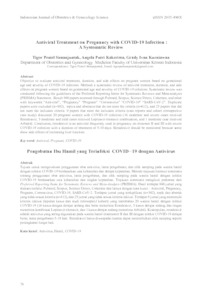 Tujuan untuk mengevaluasi penggunaan obat antivirus, lama pengobatan, dan efek samping pada wanita hamil dengan infeksi COVID-19 berdasarkan usia kehamilan dan derajat keparahan. Metode tinjauan literatur sistematis tentang penggunaan obat antivirus, lama pengobatan, dan efek samping pada wanita hamil dengan infeksi COVID-19 berdasarkan usia kehamilan dan tingkat keparahan. Tinjauan sistematis mengikuti pedoman dari Preferred Reporting Items for Systematic Reviews and Meta-Analysis (PRISMA). Hasil terdapat 948 jurnal yang diakses melalui Pubmed, Scopus, Science Direct, Cohcrane dan lainya dengan kata kunci : Antiviral, Pregnancy, Pregnant, Coronavirus, COVID-19, SARS-CoV-2. Terdapat jurnal yang terduplikasi (n=302), topik dan abstrak yang tidak sesuai kriteria (n=612), dan 25 jurnal yang tidak sesuai kriteria inklusi. Terdapat 9 jurnal yang memenuhi kriteria inklusi (laporan kasus dan studi retrosepktif kohort) yang membahas 20 wanita hamil dengan infeksi COVID-19 (16 kasus dengan derajat sedang dan berat menerima Remdesivir, 3 kasus derajat sedang dan ringan menerima kombinasi Lopinavir-ritonavir, dan 1 kasus derajat sedang menerima Arbidol). Kesimpulan, remdesivir adalah antivirus yang sering digunakan pada wanita hamil trisemester II dan III dengan infeksi COVID-19 derajat berat, lama pengobatan 5-10 hari. Remdesivir harus diwaspadai karena dapat menimbulkan efek samping seperti peningkatan fungsi hati. Kata kunci: Antivirus, Hamil, COVID-19 / Objective to evaluate antiviral treatment, duration, and side effects on pregnant women based on gestational age and severity of COVID-19 infection. Method: a systematic review of antiviral treatment, duration, and side effects on pregnant women based on gestational age and severity of COVID-19 infection. Systematic review was conducted following the guidelines of the Preferred Reporting Items for Systematic Reviews and Meta-analysis (PRISMA) Statement. Result 948 papers accessed through Pubmed, Scopus, Science Direct, Cohcrane, and other with keywords “Antiviral”, “Pregnancy” “Pregnant” “Coronavirus” “COVID-19” “SARS-CoV-2”. Duplicate papers were excluded (n=302), topics and abstracts that do not meet the criteria (n=612), and 25 papers that did not meet the inclusion criteria. 9 papers that meet the inclusion criteria (case reports and cohort retrospective case study) discussed 20 pregnant women with COVID-19 infection (16 moderate and severe cases received Remdesivir, 3 moderate and mild cases received Lopinavir-ritonavir combination, and 1 moderate case received Arbidol). Conclusion, remdesivir is an antiviral frequently used in pregnancy on trimester II and III with severe COVID-19 infection with a duration of treatment of 5-10 days. Remdesivir should be monitored because some show side effects of increasing liver function. Key word: Antiviral, Pregnant, COVID-19