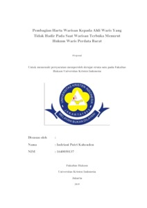 Kahendou, Indriani Putri (2019) Pembagian Harta Warisan Kepada Ahli Waris Yang Tidak Hadir Pada Saat Warisan Terbuka Menurut Hukum Waris Perdata Barat. S1 thesis, Universitas Kristen Indonesia.