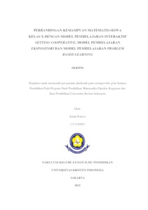 Pratiwi, Indah (2021) Perbandingan Kemampuan Matematis Siswa Kelas X dengan Model Pembelajaran Interaktif Setting Cooperative, Model Pembelajaran Ekspositori dan Model Pembelajaran Problem Based Learning. S1 thesis, Universitas Kristen Indonesia.