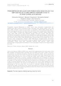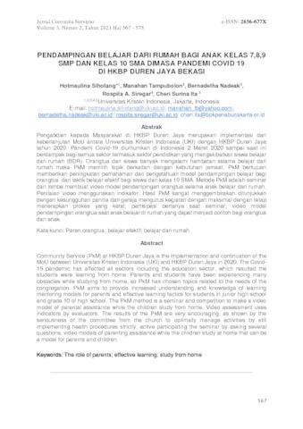 Pengabdian kepada Masyarakat di HKBP Duren Jaya merupakan implementasi dan keberlanjutan MoU antara Universitas Kristen Indonesia (UKI) dengan HKBP Duren Jaya tahun 2020. Pandemi Covid-19 diumumkan di Indonesia 2 Maret 2020 sampai saat ini berdampak bagi semua sektor termasuk sektor pendidikan yang mengakibatkan siswa belajar dari rumah (BDR). Orangtua dan siswa banyak mengalami hambatan selama belajar dari rumah maka PkM memilih topik berkaitan dengan kebutuhan jemaat. PkM bertujuan memberikan peningkatan pemahaman dan pengetahuan model pendampingan belajar bagi orangtua dan taktik belajar efektif bagi siswa dan kelas 10 SMA. Metode PkM adalah seminar dan lomba membuat video model pendampingan orangtua selama anak belajar dari rumah. Penilaian video menggunakan indikator. Hasil PkM sangat menggembirakan ditunjukkan dengan kesungguhan panitia dari gereja mengurus kegiatan dengan maksimal dengan tetap menerapkan prokes yang ketat, partisipasi bertanya saat seminar, video model pendampingan orangtua saat anak belajar di rumah yang dapat menjadi contoh bagi orangtua dan anak. Kata kunci: Peran orangtua; belajar efektif; belajar dari rumah /Community Service (PkM) at HKBP Duren Jaya is the implementation and continuation of the MoU between Universitas Kristen Indonesia (UKI) and HKBP Duren Jaya in 2020. The Covid�19 pandemic has affected all sectors including the education sector, which resulted the students were learning from home. Parents and students have been experiencing many obstacles while studying from home, so PkM has chosen topics related to the needs of the congregation. PkM aims to provide increased understanding and knowledge of learning mentoring models for parents and effective learning tactics for students in junior high school and grade 10 of high school. The PkM method is a seminar and competition to make a video model of parental assistance while the children study from home. Video assessment uses indicators by evaluators. The results of the PkM are very encouraging, as shown by the seriousness of the committee from the church to optimally manage activities by still implementing health procedures strictly, active participating the seminar by asking several questions, video models of parenting assistance while the children study at home that can be a model for parents and children. Keywords: The role of parents; effective learning; study from home