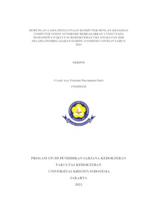 Putri, I Gusti Ayu Tenriani Parranatta (2021) Hubungan Lama Penggunaan Komputer dengan Kejadian Computer Vision Syndrome Berdasarkan CVSS17 Pada Mahasiswa Fakultas Kedokteran UKI Angkatan 2020 Selama Pembelajaran Daring Pandemi COVID-19 Tahun 2021. S1 thesis, Universitas Kristen Indonesia.