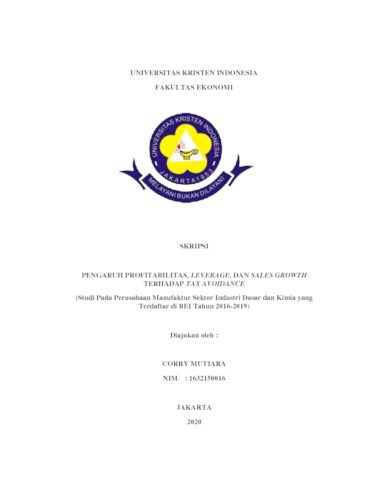 Mutiara, Corry (2020) Pengaruh Profitabilitas, Leverage, dan Sales Growth terhadap Tax Avoidance (Studi pada Perusahaan Manufaktur Sektor Industri Dasar dan Kimia yang Terdaftar di BEI Tahun 2016-2019). S1 thesis, Universitas Kristen Indonesia.