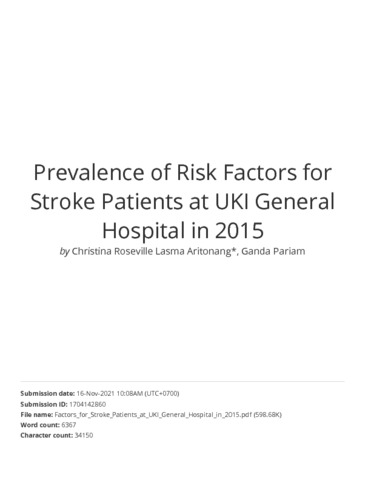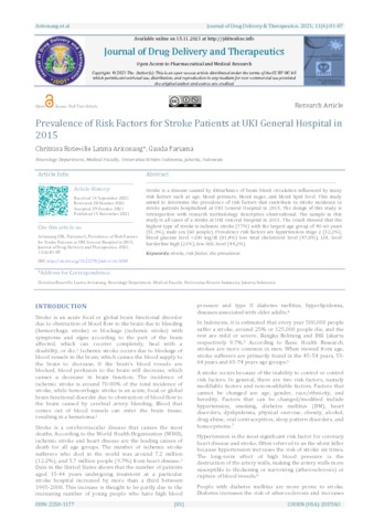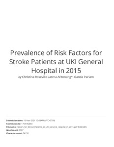 Aritonang, Christina Roseville Lasma and Pariama, Ganda (2021) Prevalence of Risk Factors for Stroke Patients at UKI General Hospital in 2015. Journal of Drug Delivery and Therapeutics, 11 (6). pp. 81-87. ISSN 2250 1177