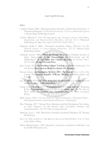 Penelitian ini bertujuan untuk mengetahui proses masuknya budaya populer Korea Selatan di Meksiko dan terutama keberhasilan idol K-Pop Super Junior mendapatkan popularitas dalam persepsi masyarakat Meksiko. Masyarakat yang tergabung dalam fandom memiliki persepsi baik akibat kehadiran Korea Selatan dan budayanya tersebut. Secara khusus, musik pop Korea banyak menyajikan lirik dan frasa motivasi yang dipandang berbeda dengan musik Latin yang biasanya mengandung unsur kekerasan. Topik ini menarik karena Meksiko merupakan negara yang masyarakatnya akrab dengan budaya Eropa dan Amerika bukan Asia. Untuk memahami fenomena tersebut, studi ini akan menggunakan konsep budaya populer, soft power, diplomasi budaya, dan network society. Penelitian ini menggunakan metode kualitatif dengan teknik pengumpulan data seperti survei literatur dan wawancara. Studi ini menunjukkan bahwa penyebaran budaya populer Korea Selatan dan popularitas Super Junior di Meksiko disebabkan oleh dua hal. Pertama, pemerintah Korea Selatan secara aktif melakukan diplomasi budaya melalui pendirian Korean Culture Center di Meksiko, pelaksanaan Festival, Ajang Kompetisi, World Tour. Kedua, kemajuan teknologi informasi dan komunikasi turut memperlancar arus informasi dan pengetahuan tentang budaya populer Korea Selatan sehingga meningkatkan popularitas budaya popular Korea Selatan termasuk melalui idol K-Pop Super Junior. Kata kunci: Budaya Populer, Soft Power, Diplomasi Budaya, Network Society, Idol K-Pop Super Junior/ This study aims to determine the penetration of South Korean popular culture in Mexico and especially the success of K-Pop Idol Super Junior in gaining popularity in the perception of Mexican society. People who are members of fandom have a good perception of South Korea and its culture. Especially, Korean pop music presents a lot of motivational lyrics and phrases that are seen as different from Latin music which usually contains elements of violence. This topic is interesting because Mexico is a country whose people are familiar with European and American culture, not Asia. To understand this phenomenon, this study will use the concepts of popular culture, soft power, cultural diplomacy, and network society. This study uses qualitative methods with data collection such as literature survey and interviews. This study shows that the spread of South Korean popular culture and Super Junior's popularity in Mexico is caused by two things. First, the South Korean government is actively conducting cultural diplomacy through the establishment of a Korean Culture Center in Mexico, holding Festivals, Competitions, and World Tours. Second, the advances in information and communication technology have helped to facilitate the flow of information and knowledge about South Korean popular culture, thereby increasing the popularity of South Korean popular culture, including K-Pop Idol Super Junior.