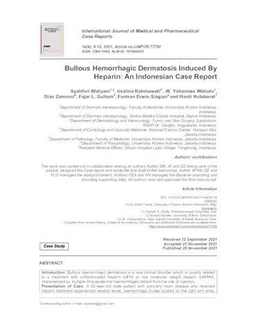 Widiyani, Syahfori and Rahmawati, Irsalina and Widodo, W. Yohannes and Zamroni, DIan and Gultom, Fajar Lamhot and Siagian, Forman Erwin and Hutabarat, Hardi (2021) Bullous Hemorrhagic Dermatosis Induced By Heparin: An Indonesian Case Report. International Journal of Medical and Pharmaceutical Case Reports, 14 (4). pp. 8-12. ISSN 2394 109X