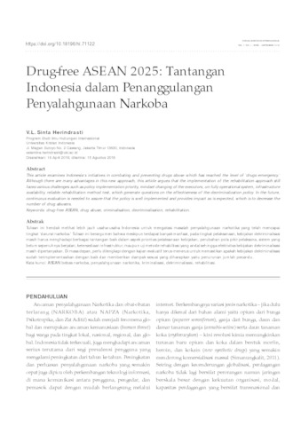 Herindrasti, VL Sinta (2018) Drug-free ASEAN 2025 Tantangan Indonesia dalam Penanggulangan Penyalahgunaan Narkoba. Jurnal Hubungan Internasional, 7 (1). pp. 19-33. ISSN 2503 3883