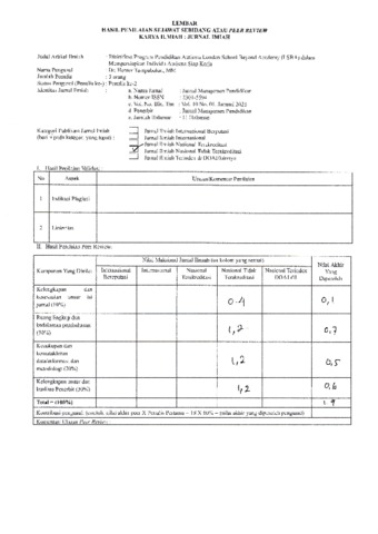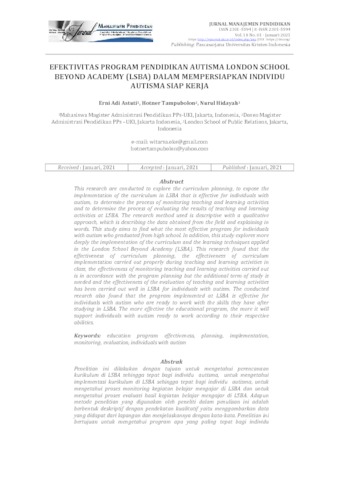 his research are conducted to explore the curriculum planning, to expose the implementation of the curriculum in LSBA that is effective for individuals with autism, to determine the process of monitoring teaching and learning activities and to determine t he process of evaluating the results of teaching and learning activities at LSBA. The research method used is descriptive with a qualitative approach, which is describing the data obtained from the field and explaining in words. This study aims to find what the most effective program for individuals with autism who graduated from high school. In addition, this study explores more deeply the implementation of the curriculum and the learning techniques applied in the London School Beyond Academy (LSBA). This research found that the effectiveness of curriculum planning, the effectiveness of curriculum implementation carried out properly during teaching and learning activities in class, the effectiveness of monitoring teaching and learning activities carried out is in accordance with the program planning but the additional term of study is needed and the effectiveness of the evaluation of teaching and learning activities has been carried out well in LSBA for individuals with autism. The conducted reearch also found that the program implemented at LSBA is effective for individuals with autism who are ready to work with the skills they have after studying in LSBA. The more effective the educational program, the more it will support individuals with autism ready to w ork according to their respective abilities. Keywords: education program effectiveness, planning, implementation, monitoring, evaluation, individuals with autism / Penelitian ini dilakukan dengan tujuan untuk mengetahui perencanaan kurikulum di LSBA sehingga tepat bagi individu autisma, untuk mengetahui implementasi kurikulum di LSBA sehingga tepat bagi individu autisma, untuk mengetahui proses monitoring kegiatan belajar mengajar di LSBA dan untuk mengetahui proses evaluasi hasil kegiatan belajar mengajar di LSBA. Adapun metode penelitian yang digunakan oleh peneliti dalam penulisan ini adalah berbentuk deskriptif dengan pendekatan kualitatif yaitu menggambarkan d ata yang didapat dari lapangan dan menjelaskannya dengan kata- kata. Penelitian ini bertujuan untuk mengetahui program apa yang paling tepat bagi individu Penulis1, Penulis2 (Cambria 9 ) TATA CARA PENULISAN NASKAH JURNAL MANAJEMEN PENDIDIKAN (Huruf Capital, Cambria 9 ) | 47 autisma selepas SMA selain itu penelitian ini menggali lebih dalam implementasi dari kurikulum yang diterapkan serta teknik pembelajaran yang dilakukan oleh London School Beyond Academy (LSBA). Dari penelitian yang telah dilaksanakan ditemukan hasil efektivitas perencanaan kurikulum yang dilaksanakan di LSBA bagi individu autisma, efektivitas implementasi kurikulum dimana semua dapat terlaksana dengan baik selama kegiatan belajar mengajar di kelas, efektivitas monitoring kegiatan belajar mengajar yang dilakukan sudah sesuai dengan perencanaan program namun diperlukan penambahan waktu yang lebih lama dan efektivitas evaluasi kegiatan belajar mengajar sudah dilaksanakan dengan baik di LSBA. Setelah dilaksanakan penelitian ini dilapangan maka dapat ditemukan bahwa program yang dilaksanakan di LSBA ini efektif bagi individu autisma siap bekerja dengan adanya ke terampilan yang dimiliki setelah belajar di LSBA. Semakin efektif program pendidikan maka semakin menjadikan individu autisma siap bekerja sesuai dengan kemampuannya masing – masing. Kata Kunci: efektivitas program pendidikan, perencanaan, implementasi, monitoring, evaluasi, individu autisma