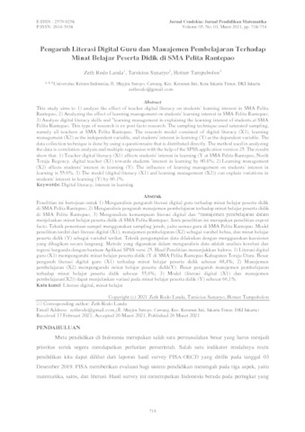 This study aims to 1) analyze the effect of teacher digital literacy on students' learning interest in SMA Pelita Rantepao; 2) An alyzing the effect of learning management on students' learning interest in SMA Pelita Rantepao; 3) Analyze digital literacy skills and "learning management in explaining the learning interest of students at SMA Pelita Rantepao. This type of research is ex post facto resear ch. The sampling technique used saturated sampling, namely all teachers at SMA Pelita Rantepao. The research model consisted of digital literacy (X1), learning management (X2) as the independent variable, and students' interest in learnin g (Y) as the depen dent variable. The data collection technique is done by using a questionnaire that is distributed directly. The method used in analyzing the data is correlation analysis and multiple regression with the help of the SPSS application versio n 25. The results show that: 1) Teacher digital literacy (X1) affects students' interest in learning (Y at SMA Pelita Rantepao, North Toraja Regency. digital teacher (X1) towards students 'interest in learning by 60.4%; 2) Learning management (X2) affects students' interest in learning (Y). The influence of learning management on students' interest in learning is 55.6%; 3) The model (digital literacy (X1) and learning management (X2)) can explain variations in students' interest in learning (Y) by 66.1%. Keywords: Digital li teracy, interest in learning/Penelitian ini bertujuan untuk 1) Menganalisis pengaruh literasi digital guru terhadap minat belajar peserta didik di SMA Pelita Rantepao; 2) Menganalisis pengaruh manajemen pembelajaran ter hadap minat belajar peserta didik di SMA Pelita Rantepao; 3) Menganalisis kemampuan literasi digital dan “manajemen pembelajaran dalam menjelaskan minat belajar peserta didik di SMA Pelita Rantepao. Jenis penelitian ini merupakan penelitian expost facto. T eknik penentuan sampel mengg unakan sampling jenuh, yaitu semua guru di SMA Pelita Rantepao. Model penelitian terdiri dari literasi digital (X1), manajemen pembelajaran (X2) sebagai varabel bebas, dan minat belajar peserta didik (Y) sebagai variabel terikat . Teknik pengumpulan data di lakukan dengan menggunakan kuesioner yang dibagikan secara langsung. Metode yang digunakan dalam menganalisis data adalah analisis korelasi dan regresi berganda dengan bantuan Aplikasi SPSS versi 25. Hasil Penelitian menunjukkan bahwa: 1) Literasi digital guru (X1) mempengaruhi minat belajar peserta didik (Y di SMA Pelita Rantepao Kabupaten Toraja Utara. Besar pengaruh literasi digital guru (X1) terhadap minat belajar peserta didik sebesar 60,4%; 2) Manajemen pembelajaran (X2) me mpengaruhi minat belajar pes erta didik(Y). Besar pengaruh manajemen pembelajaran terhadap minat belajar peserta didik sebesar 55,6%; 3) Model (literasi digital (X1) dan manajemen pembelajaran(X2)) dapat menjelaskan variasi pada minat belajar peserta didik (Y) sebesar 66,1% . Kata k unc i : Literasi digital, minat belajar