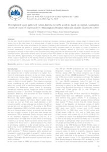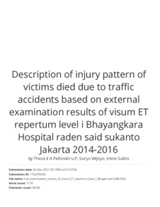 Pellondo'u P, Theza E A and Wijoyo, Suryo and Napitupulu, Irene Sulinsia (2021) Description of injury pattern of victims died due to traffic accidents based on external examination results of visum ET repertum level i Bhayangkara Hospital raden said sukanto Jakarta 2014-2016. International Journal of Medical and Health Research, 7 (12). pp. 18-25. ISSN 2454 9142