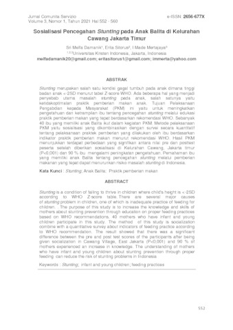 Damanik, Sri Melfa and Sitorus, Erita and Mertajaya, I Made (2021) Sosialisasi Pencegahan Stunting pada Anak Balita di Kelurahan Cawang Jakarta Timur. Jurnal Comunita Servizio, 3 (1). pp. 552-560. ISSN 2656 677X
