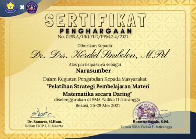 Simbolon, Kerdid (2021) Sertifikat Penghargaan sebagai Nasasumber dalam Kegiatan PKM : Pelatihan Strategi Pembelajaran Materi Matimatika secara Daring. UKI. (Unpublished)